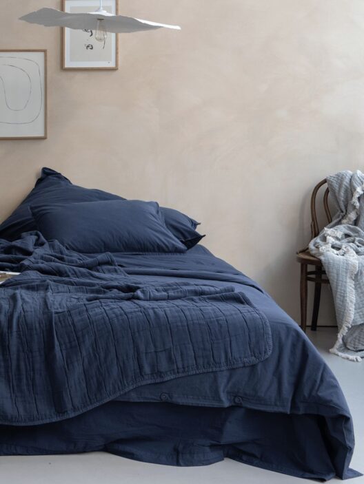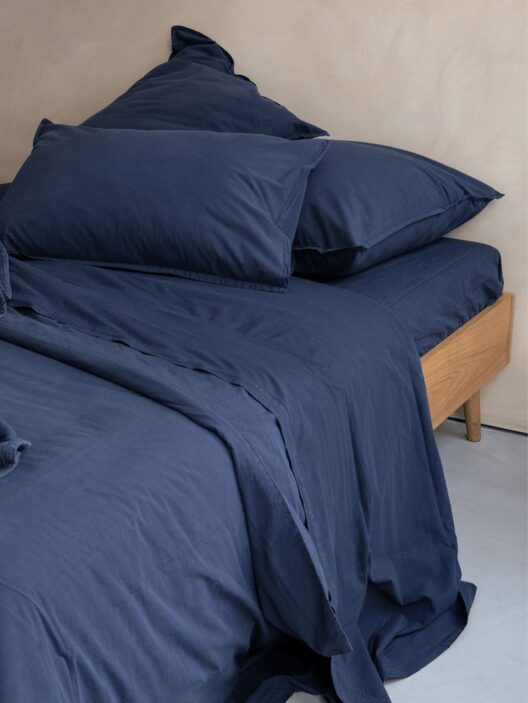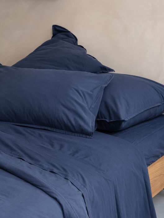 A dark and intense colour, an echo of the elements beyond us. Contemporary and elegant, the colour dark blue flirts with black and depths. It envelops us in the moonless summer night thickness. It carries us away from the coast, plunging us into the ocean unfathomable abyss. Often associated with inner calm, the colour combines wonderfully with “Sand” for a seaside feel. Or with the "Toile de Jouy" print for an artistic classic.