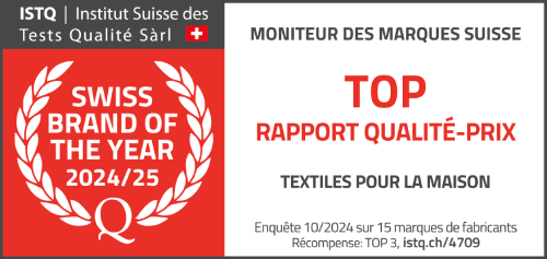 Ce soin du détail et cette exigence nous ont permis d’être reconnus cette année comme la Maque suisse de l’année par le SIQT (Institut suisse des tests de qualité) dans la catégorie textile de maison pour le meilleur rapport qualité prix. Notre volonté et challenge désormais est de conserver cette distinction le plus longtemps possible pour encore plus de clients satisfaits.